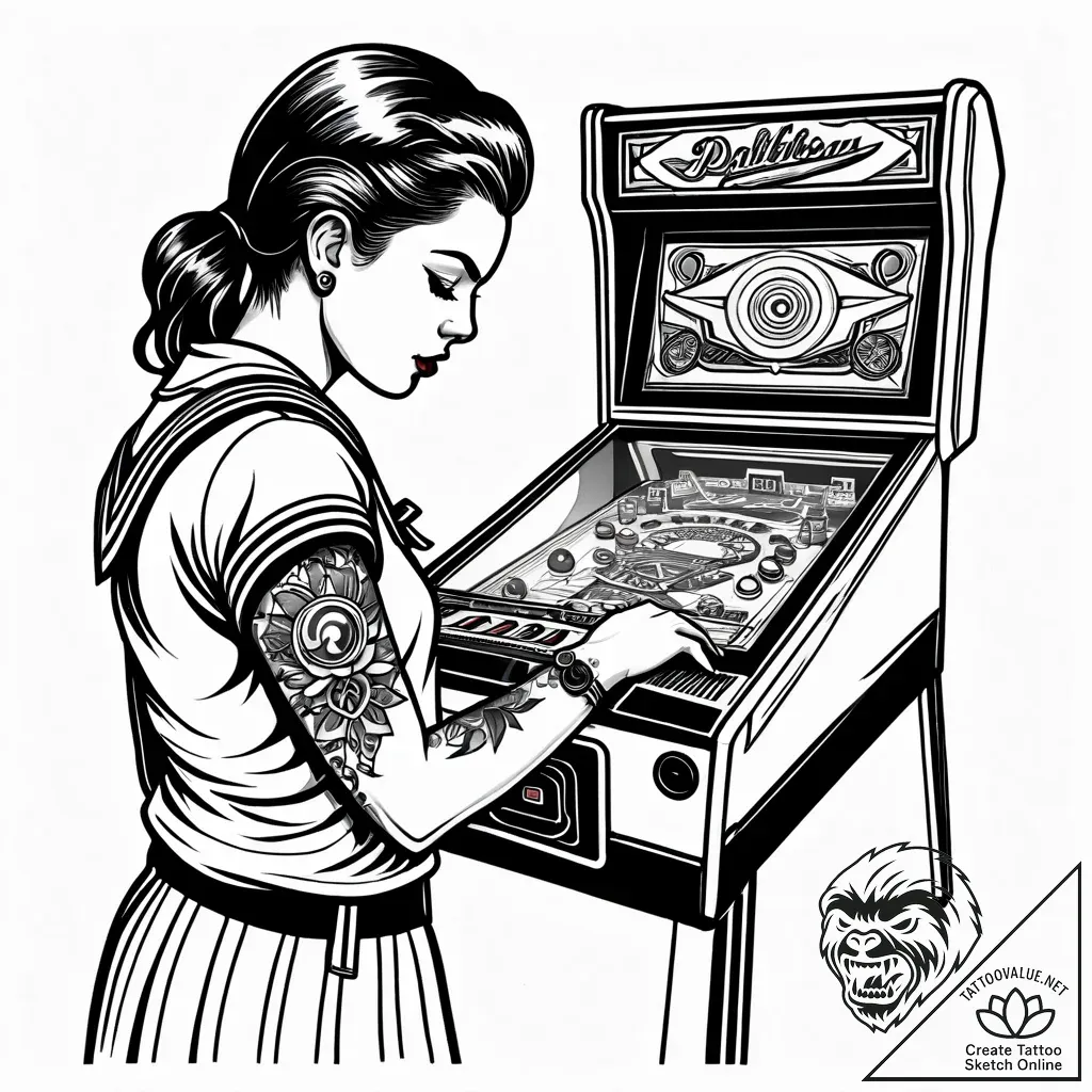 This sketch is ideal for individuals who possess a vibrant, playful personality with an appreciation for retro culture and a touch of old-school charm. It would look striking on the forearm, allowing the details of the pinball machine and the woman's tattoos to be clearly visible, or as a bold statement on the calf. For a more immersive experience, consider placing it on the thigh, where the narrative of the scene can unfold across the skin.