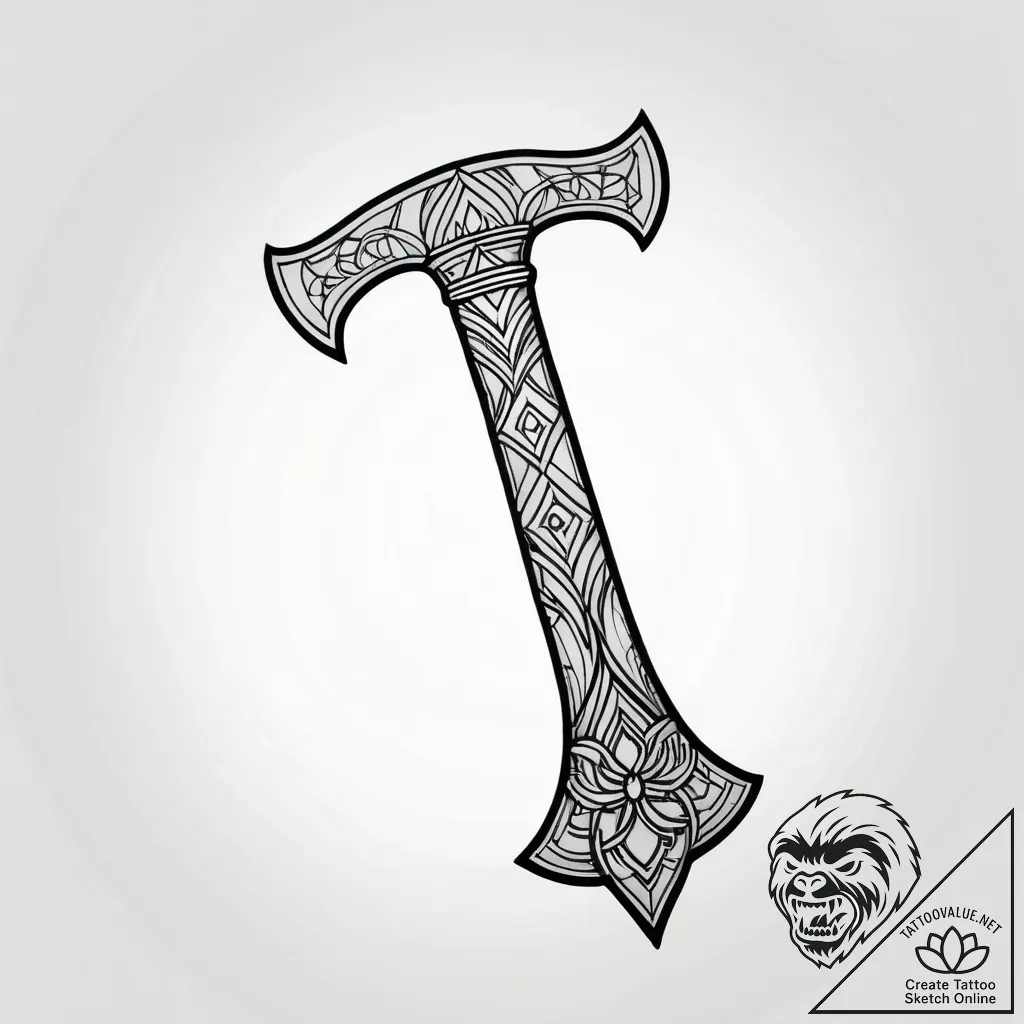 This striking black and grey tattoo sketch presents an intricately adorned axe, a symbol of raw power tempered by refined artistry. The design melds the primal force of the tool with the harmonious fl