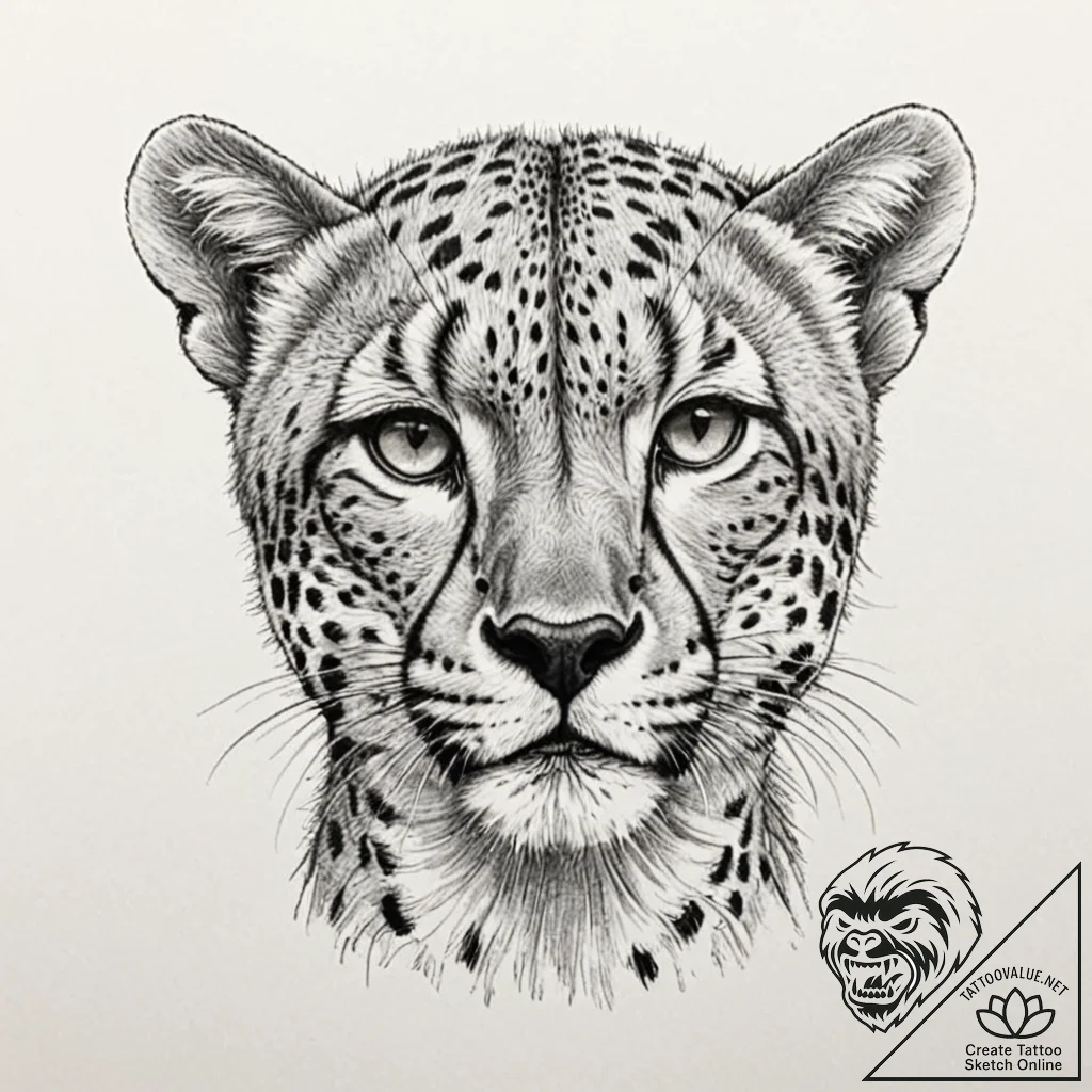 This stylish design inspired by “a powerful cheetah, its eyes locked on its goal, tattoo flash sheet design, muted color palette, desaturated colors, vintage tattoo feel, bold outlines, thick lines, heavy linework, realistic black and grey tattoo, photorealistic detail, soft shading, on a clean white paper, isolated” was created especially for you at tattoovalue.net.
