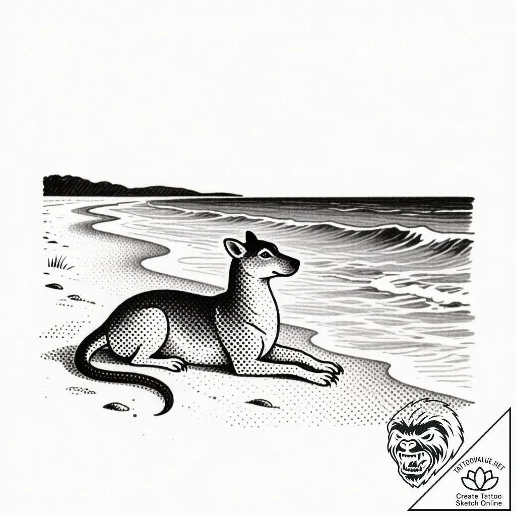 This striking black and grey tattoo sketch captures a serene moment, with a lone canine figure resting on a sandy shore as the gentle tide washes in. Rendered with exquisite dotwork, including whip sh