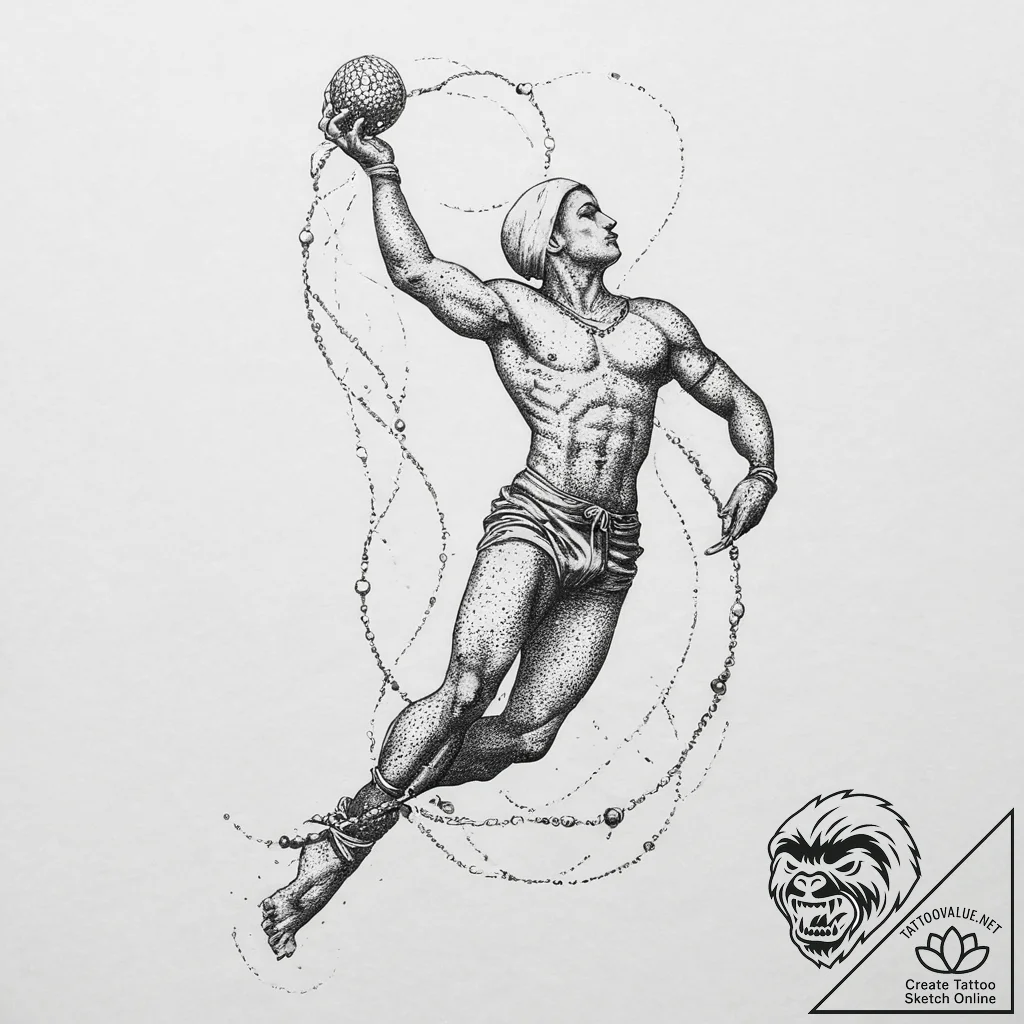 Presenting a original tattoo sketch, generated based on your request “a shot of a pearl diver at work., artistic tattoo sketch, linework tattoo style, clean fine lines, single needle line art, outline tattoo, on a clean white paper, isolated, sepia tone sketch, vintage paper look, dotwork shading, stippling texture, pointillism effect for tattoo” at tattoovalue.net.