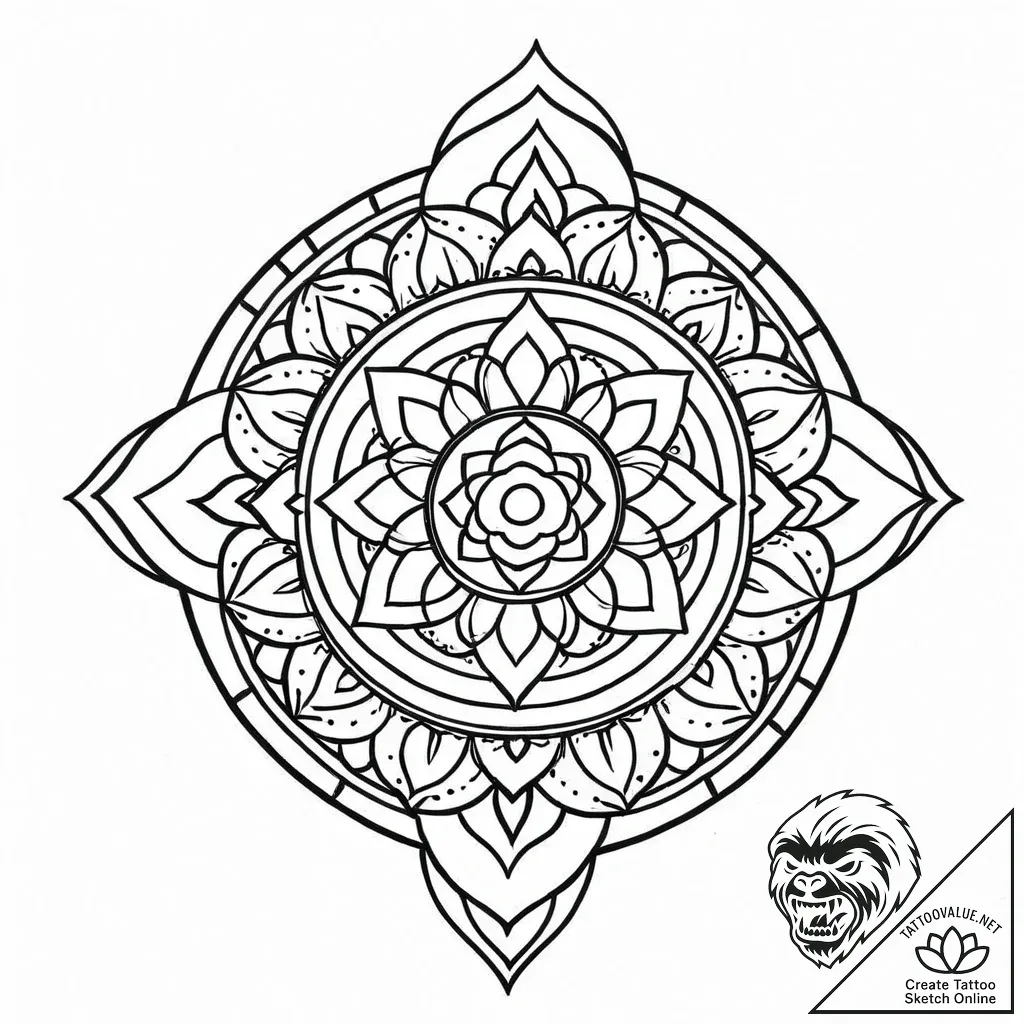 This tattoo sketch unfolds like a blossoming flower, meticulously rendered in sepia tones reminiscent of ancient blueprints. The design is a captivating interplay of geometric precision and organic forms, radiating outwards from a central lotus-like core. Its crisp linework and symmetrical composition evoke a sense of harmony and meditative calm, a visual echo of the universe's inherent order.