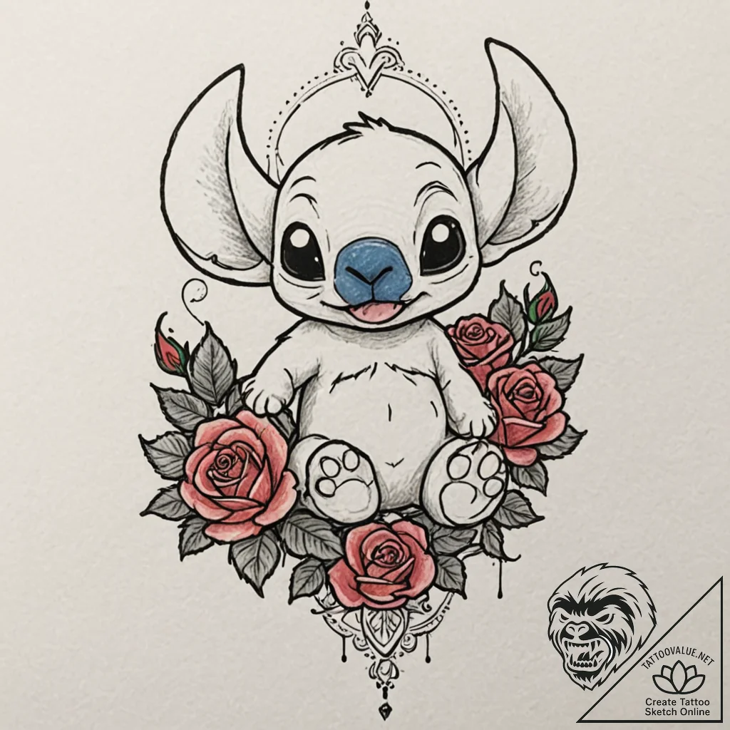 Presenting a exclusive tattoo sketch, generated based on your request “a sketch of stitch from lilo & stitch, being mischievous,, tattoo line art, rough sketchy lines, hand-drawn pencil sketch effect, artistic unfinished look, chicano tattoo style, fine line black and grey, religious iconography, lettering, roses, skulls, vibrant colors, full color spectrum, bold bright tattoo inks, stylized interpretation, graphic style, artistic stylization, aesthetically pleasing, beautiful design, studio lighting presentation, professional sketch display” at tattoovalue.net.