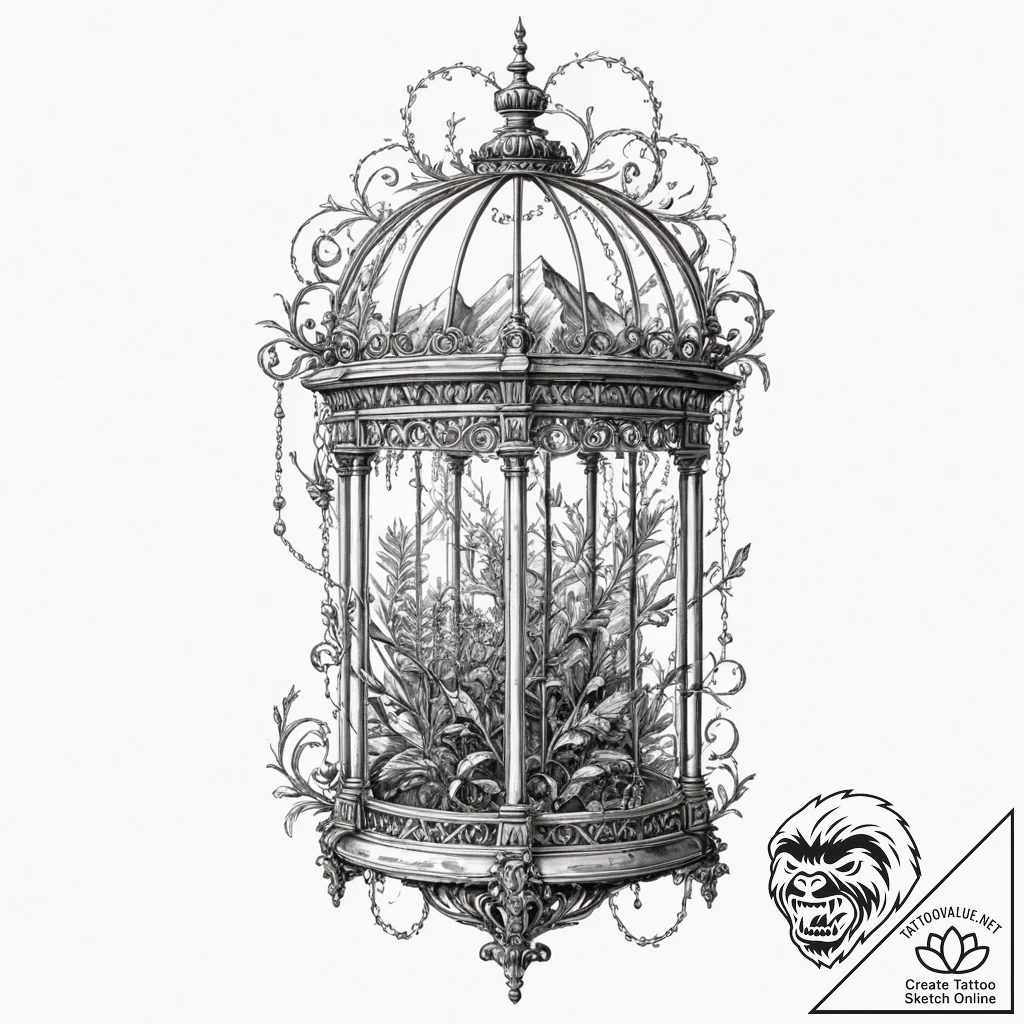 Tattoo sketch: a sketch of the glass cage from you,, artistic tattoo sketch, highly detailed, intricate patterns, complex elements, sharp details, on white paper, clean white background, isolated on w