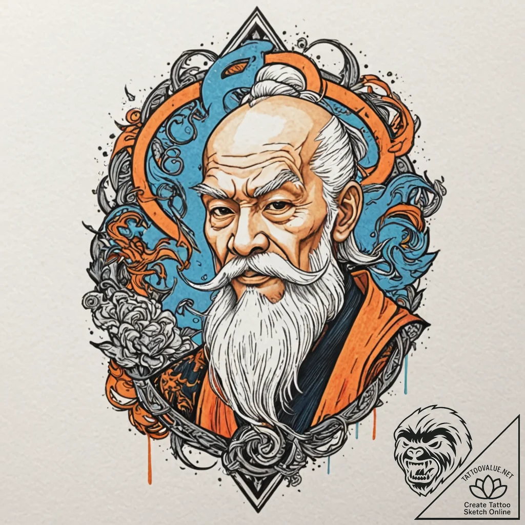 This stylish design inspired by “a sketch of the "pai mei" character, the legendary master,, tattoo flash sheet design, new school tattoo style, vibrant colors, cartoonish, graffiti art inspired, exaggerated forms, studio lighting presentation, professional sketch display, aesthetically pleasing, beautiful design, stylized interpretation, graphic style, artistic stylization, vibrant colors, full color spectrum, bold bright tattoo inks, masterpiece, best quality, top-tier, detailed cross-hatching shading, pen and ink hatching” was created especially for you at tattoovalue.net.