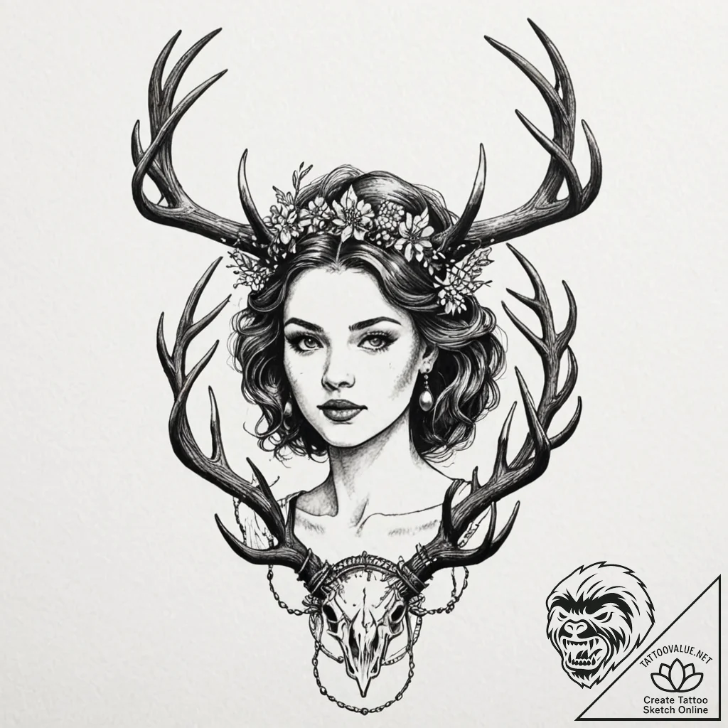 This stylish design inspired by “a trash polka sketch of the "antler queen" from yellowjackets,, ink illustration for tattoo, no background, subject focus, isolated design elements, dotwork shading, stippling texture, pointillism effect for tattoo, minimalist approach, simple forms, clean and uncluttered design, black outline only, pure linework, no shading, old school traditional tattoo, american traditional, bold lines, classic sailor tattoo motifs” was created especially for you at tattoovalue.net.