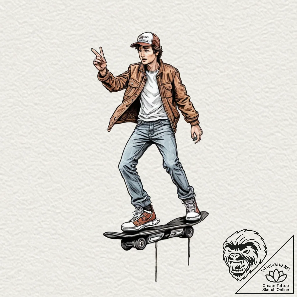 This interesting design inspired by “a watercolor sketch of marty mcfly on the hoverboard., tattoo drawing outline, masterpiece, best quality, top-tier, moderately detailed, balanced complexity, clear subject definition, sketch tattoo style, hand-drawn effect, rough lines, unfinished artistic look, cross-hatching, no background, subject focus, isolated design elements, clean lines, crisp outlines, sharp linework, sepia tone sketch, vintage paper look” was prepared especially for you at tattoovalue.net.