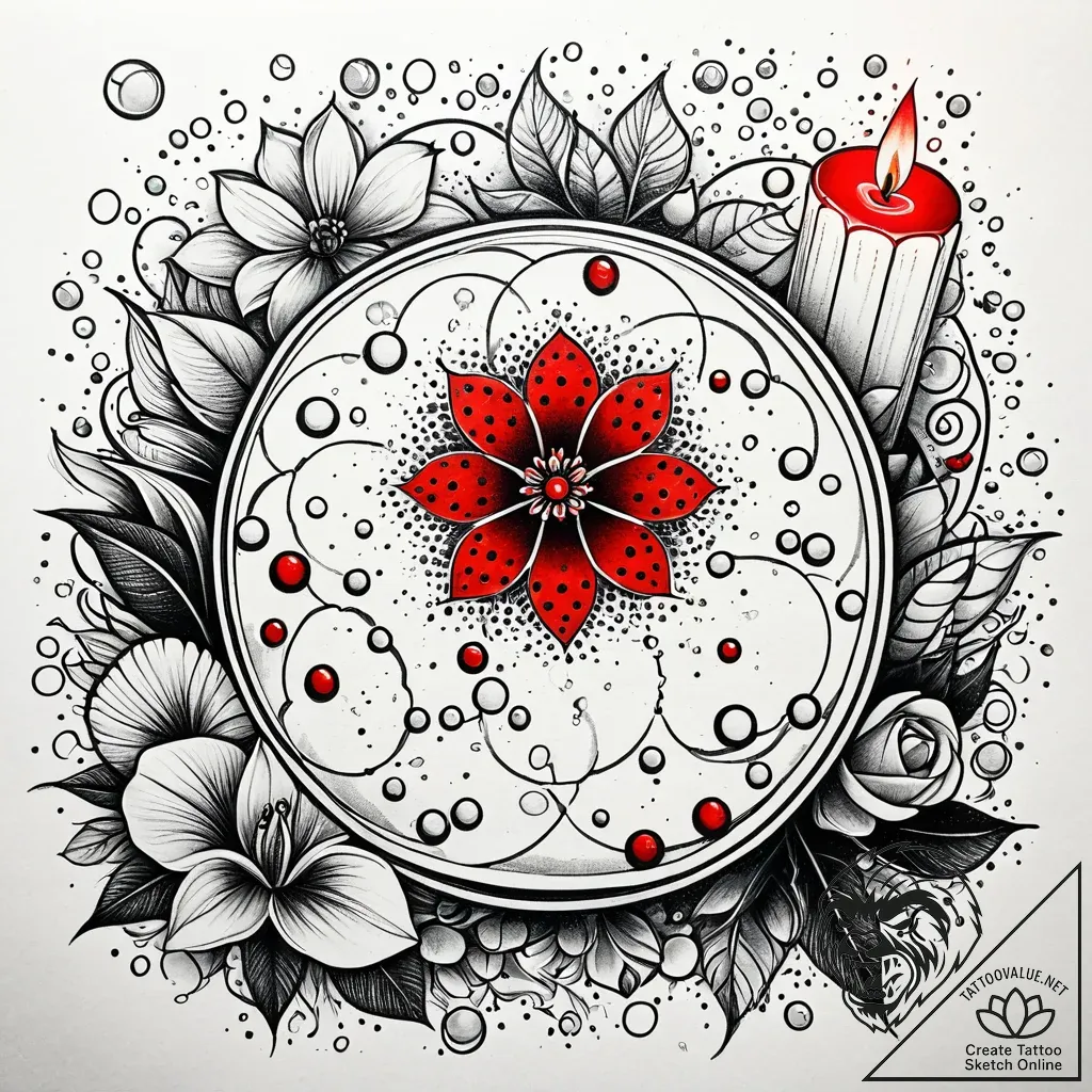 This tattoo sketch evokes a sanctuary of serenity, a whimsical bubble bath rendered in exquisite detail. The design is a captivating blend of graphic linework and delicate dotwork, creating a textured, almost ethereal quality, with a striking red floral centerpiece that blooms like a secret wish. The composition, framed by floral elements and flickering candlelight, feels both intimate and expansive, a visual exhale of ultimate relaxation.