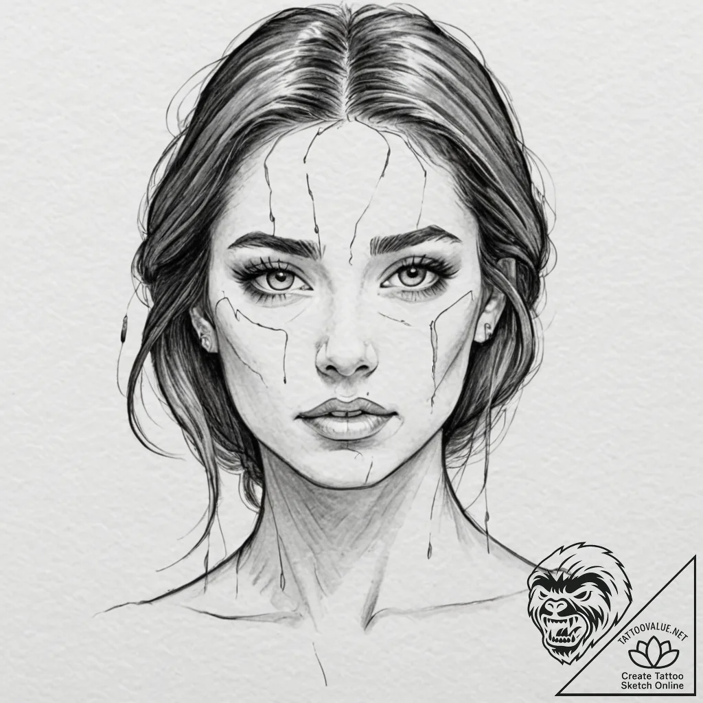 Presenting a original tattoo sketch, generated based on your request “a woman whose tears are black ink, staining her face, artistic tattoo sketch, on a clean white paper, isolated, muted color palette, desaturated colors, vintage tattoo feel, sketch tattoo style, hand-drawn effect, rough lines, unfinished artistic look, cross-hatching, rough sketchy lines, hand-drawn pencil sketch effect, artistic unfinished look” at tattoovalue.net.