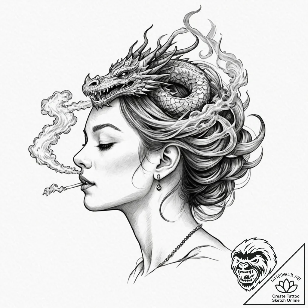 Presenting a unique tattoo sketch, created based on your request “a woman's profile, exhaling a cloud of smoke that turns into a dragon” at tattoovalue.net.