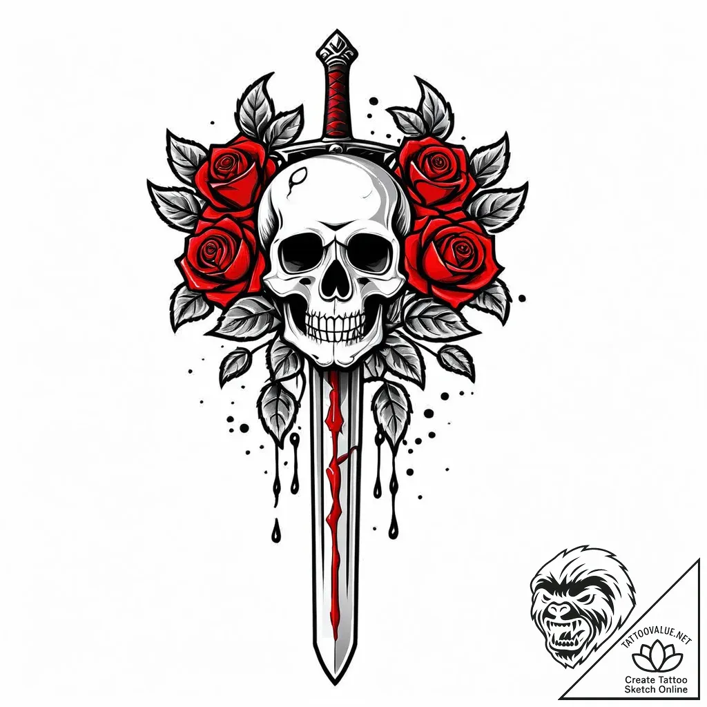 This design embodies the profound symbolism of life's inevitable end, intertwined with enduring love and beauty, as represented by the roses. The bleeding sword and skull speak to overcoming adversity, the acceptance of mortality, or perhaps a passionate, even dangerous, pursuit of one's desires. It can be a powerful statement of resilience, a reminder of sacrifice, or an emblem of a life lived fiercely.