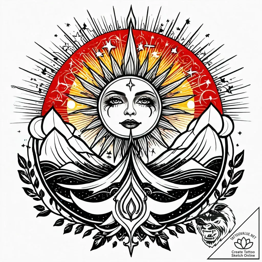 • Final Prompt for AI (EN): tattoo sketch, tattoo design, isolated tattoo sketch on pure white background, tattoo flash sheet, apocalyptic sun bleeding into sky, neo traditional tattoo, illustrative, art nouveau influence, detailed cross-hatching shading, pen and ink hatching, graphic style, stylized interpretation, dramatic two-tone, black and red ink, red accent, rich colors, clean white paper, isolated