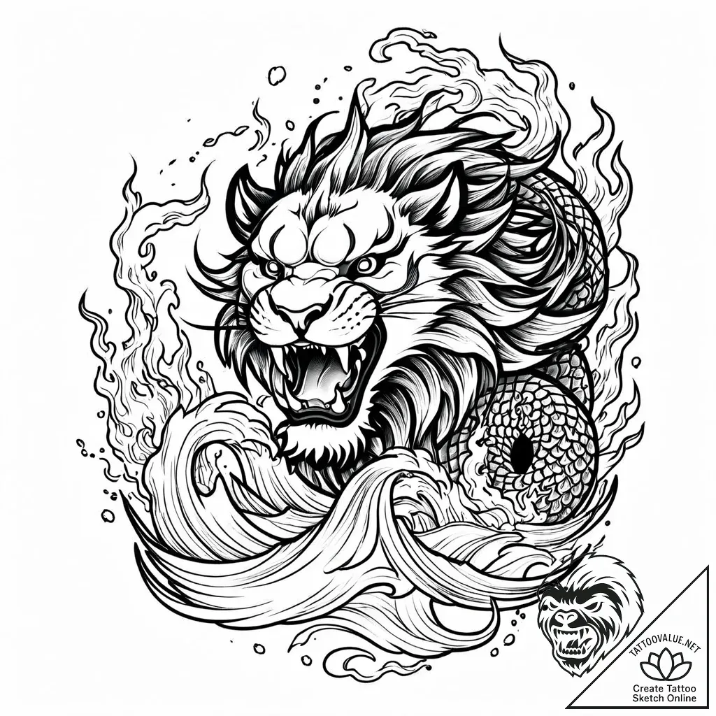 This masterful sketch portrays a fierce, arcane lion erupting from a tempestuous sea, its roar a symphony of primal power rendered in bold, clean linework. The dynamic composition, infused with the spirit of Irezumi, captures a raw, untamed energy, as if the creature is being born from the very essence of chaos and creation. Its mane flows like fiery waves, blending seamlessly with the turbulent ocean below, evoking a sense of unstoppable force and ancient myth.