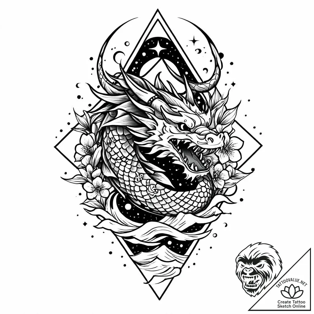 This masterful black and grey sketch depicts a fierce dragon coiled within a celestial diamond, its scales rendered with intricate dotwork and smooth gradients, evoking the serene power of a cosmic storm. Surrounded by delicate sakura blossoms and turbulent waves, the artwork merges the ethereal with the terrestrial, creating a dynamic composition that breathes with ancient energy.