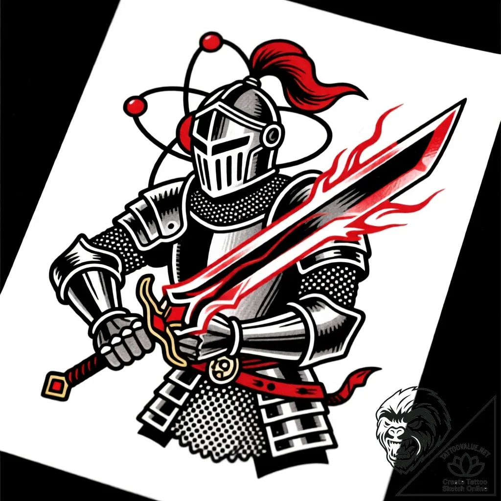 - Original User Request (RU): atomic knight with energy blade, tattoo flash sheet design, black and red ink, red accent, dramatic two-tone, old school traditional tattoo, american traditional, bold lines, classic sailor tattoo motifs, soft whip shading, pepper shading, smooth dot shading, on a clean white paper, isolated, highly detailed, intricate patterns, complex elements, sharp details