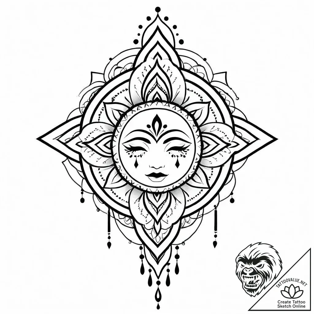 This sketch is perfect for the free-spirited individual who seeks to express their inner light and embrace a sense of spiritual depth. It would look stunning as a statement piece on the forearm, allowing the intricate details to be admired, or as a captivating centerpiece on the back between the shoulder blades, radiating outwards. Its symmetrical and balanced nature also makes it an excellent choice for the thigh or calf, accentuating the body's natural curves.