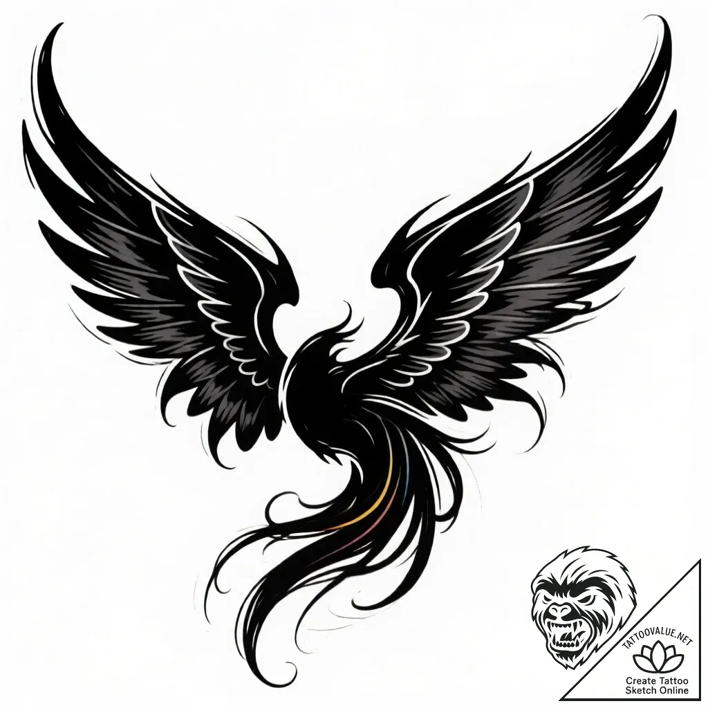 This striking blackwork design captures a phoenix rising, its form sculpted from obsidian shadows and defined by bold, thick linework that screams with dynamic energy. The spectral wings are an ethere