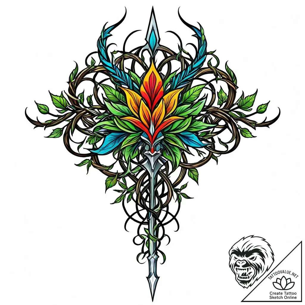 - Original User Request (RU): black thorned vines wrapping blade, tattoo sketch design, on a clean white paper, isolated, clean lines, crisp outlines, sharp linework, vibrant colors, full color spectrum, bold bright tattoo inks, neo traditional tattoo, illustrative, art nouveau influence, detailed, rich colors, moderately detailed, balanced complexity, clear subject definition, dynamic composition, sense of movement