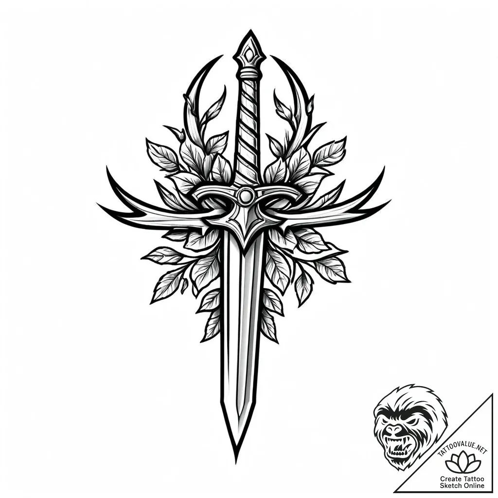 This striking blackwork sketch features a finely detailed sword, its sharp lines and intricate hilt rendered with pure linework, appearing as if etched by moonlight. Enveloping the blade is a dynamic cascade of leaves and thorns, creating a visual narrative of strength intertwined with nature's resilience. The composition evokes a sense of ancient power, a captured moment where the martial and the organic collide with elegant precision.