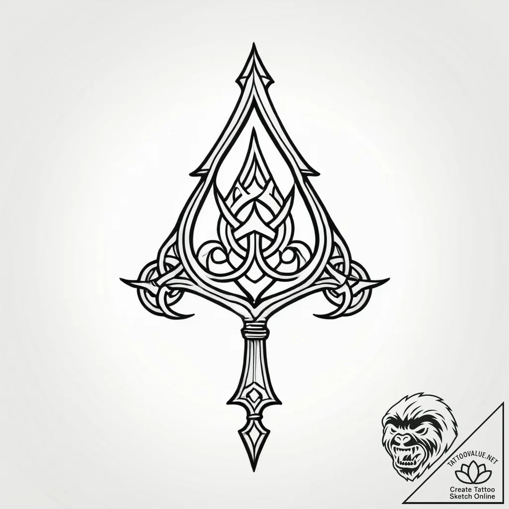 This sketch presents a striking, stylized bone sigil, reminiscent of an ancient arrowhead or a protective amulet. Its intricate knotwork, flowing with a graphic, almost calligraphic precision, evokes a sense of timeless power and mystical protection. The composition is balanced and elegant, hinting at a relic of forgotten lore, rendered with clean lines that allow the complexity of the design to breathe.