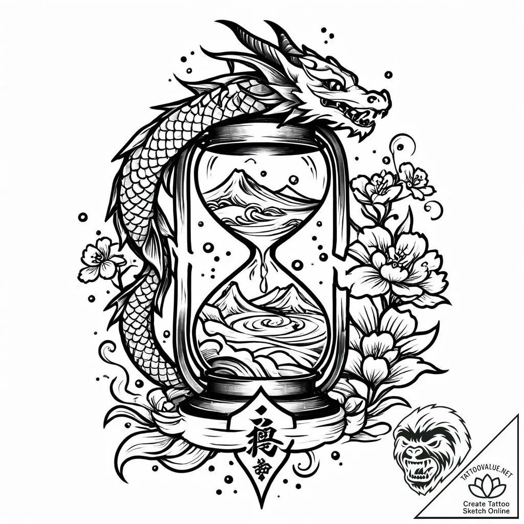 This Irezumi-inspired sketch masterfully blends the ephemeral nature of time with the enduring power of the dragon, creating a striking visual metaphor. The broken hourglass, with sand trickling like tears, forms the central pillar, embraced by a dynamic dragon whose scales mimic the flow of water. Lush peonies and stylized waves complete this graphic composition, evoking a sense of both impermanence and strength.