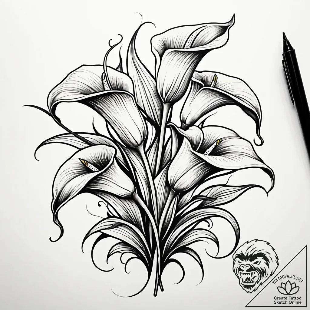 This linework tattoo sketch is a symphony of elegant calla lilies, rendered with the delicate precision of a single needle. The composition flows like liquid ink, each petal a whisper of form, creatin