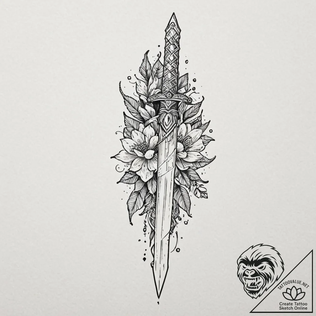 This unusual design inspired by “dagger with ice blade, tattoo drawing outline, clean lines, crisp outlines, sharp linework, vibrant colors, full color spectrum, bold bright tattoo inks, moderately detailed, balanced complexity, clear subject definition, dotwork tattoo style, stippling art, pointillism, geometric dotwork, dynamic composition, sense of movement, on a clean white paper, isolated” was generated especially for you at tattoovalue.net.