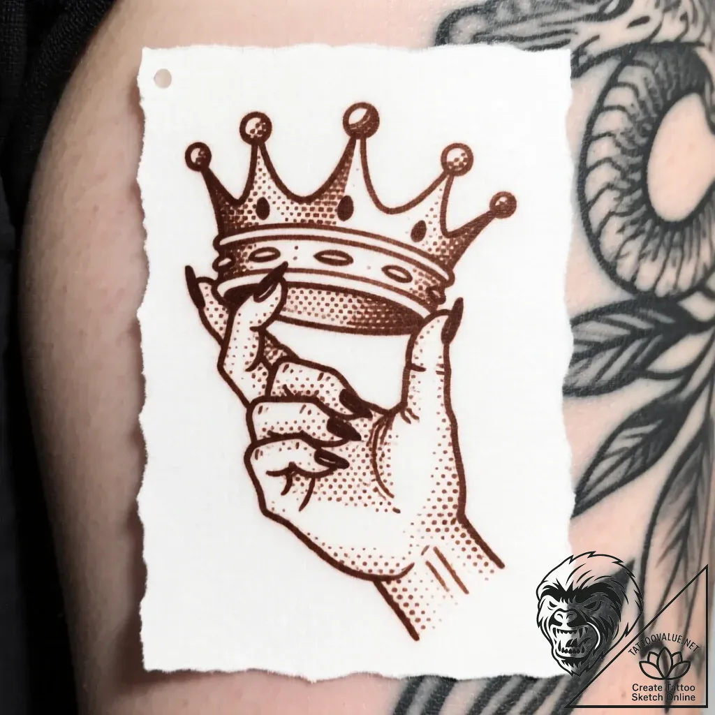This sepia-toned sketch artfully captures a hand, rendered with delicate dotwork shading, delicately grasping a regal crown. The clean lines and graphic style, reminiscent of vintage etchings, imbue the piece with a timeless elegance and a subtle sense of power.