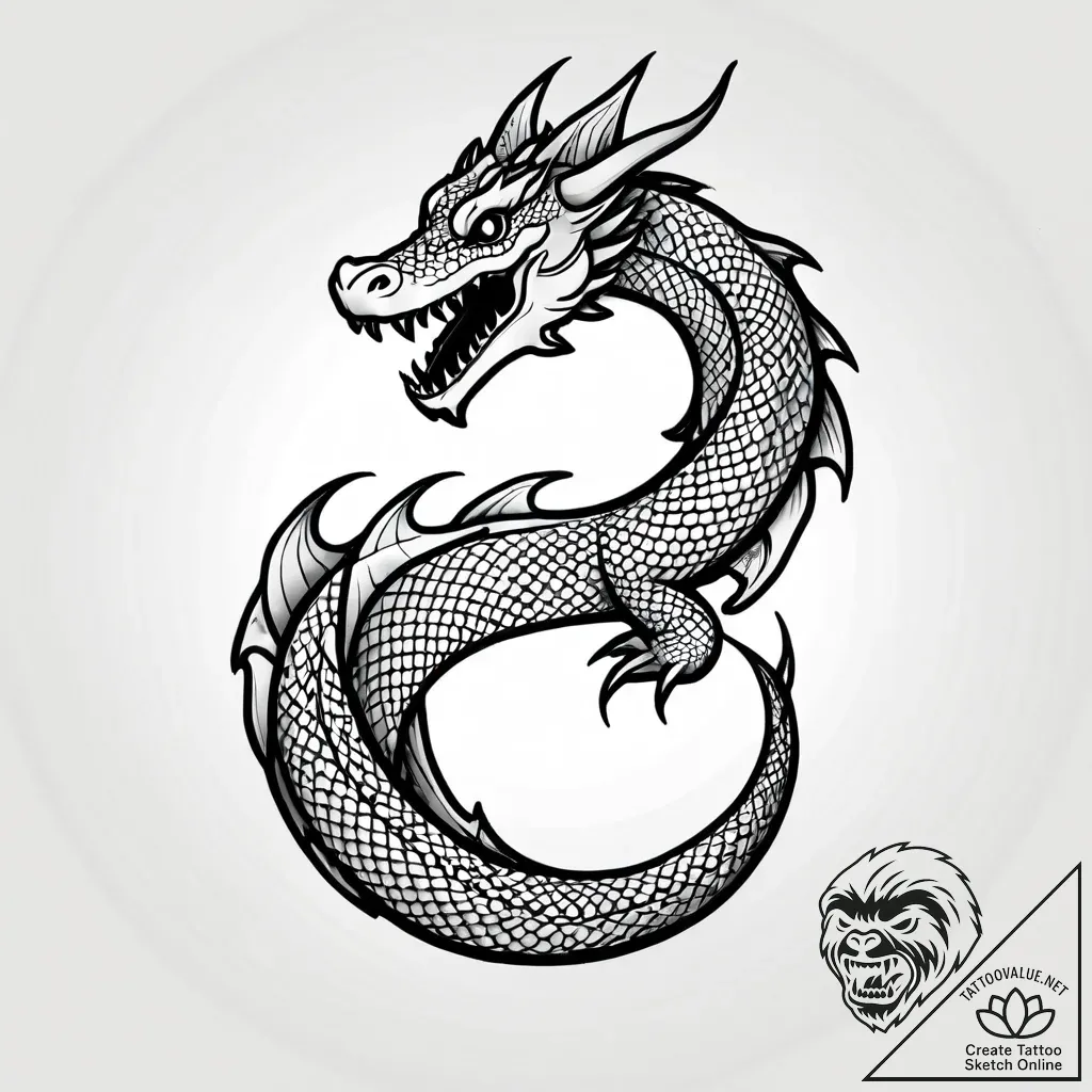 This striking black and grey tattoo sketch is a powerful fusion of Irezumi and graphic styles, depicting a fierce dragon coiled in a dynamic, S-shaped posture. The meticulously rendered scales, achiev