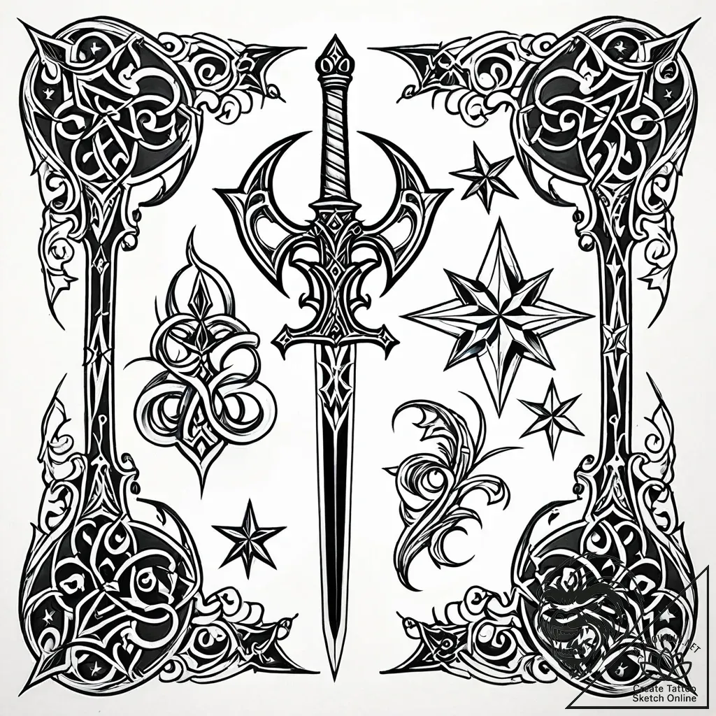 This piece is a striking graphic composition, reminiscent of ancient runic inscriptions interwoven with celestial motifs. The central sword, forged with a cosmic shard, is the heart of the design, radiating power and intent, while ornate filigree frames the scene like a gateway to a forgotten realm. The flowing linework and balanced complexity create a visually captivating narrative of creation and destiny.