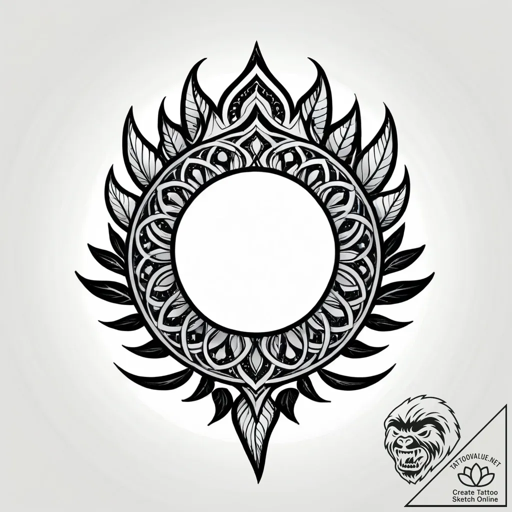 This design embodies themes of cyclical renewal, divine authority, and the interconnectedness of nature and spirit. The sun-like form signifies life, power, and enlightenment, while the leafy elements represent growth, vitality, and resilience. Such a tattoo can symbolize a strong sense of self, a connection to natural rhythms, or a desire to embody leadership and wisdom with grace.