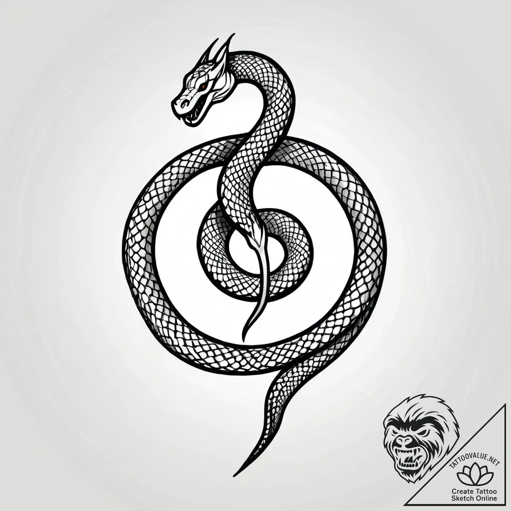 This sketch presents a striking serpent, coiled with an almost musical grace, its scales rendered with a delicate linework reminiscent of ancient engravings. The design embodies a sophisticated fusion of abstract realism and graphic elements, with subtle black and grey shading creating depth and texture. Its balanced complexity and clear subject definition make it a visually captivating piece, hinting at a narrative woven with mystery and power.