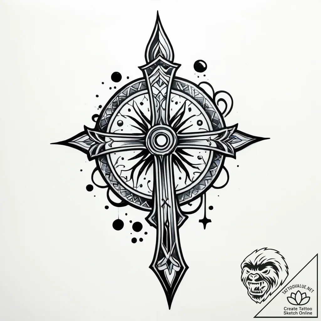 This striking tattoo sketch is a powerful fusion of gothic elegance and intricate detail, resembling a stylized compass rose interwoven with a formidable cross. The dramatic ink work, enhanced by precise cross-hatching and smooth black and grey gradients, creates a sense of depth and shadow, as if emerging from the depths of the unknown.