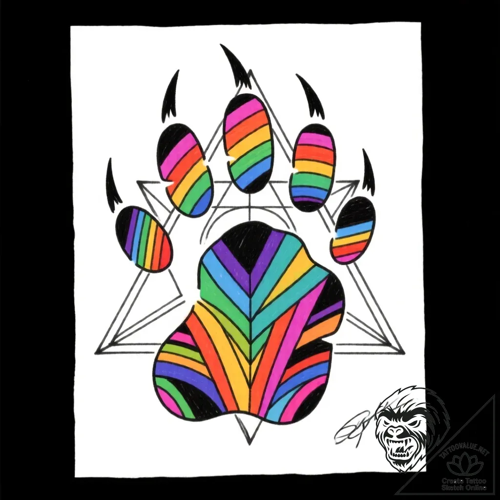 This sketch is a vibrant explosion of color and geometry, a paw print rendered with the precision of a single needle tattoo. Each toe, a prism of the full spectrum, bursts from a backdrop of sacred ge