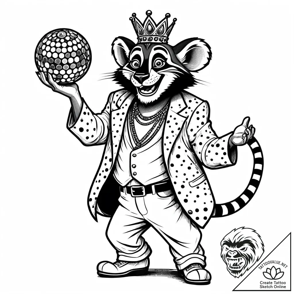 - Original User Request (RU): eskiz.to, tattoo sketch, king julien partying with disco ball, vibrant tattoo, tattoo drawing outline, black outline only, pure linework, no shading, neo traditional tattoo, illustrative, art nouveau influence, detailed, rich colors, dotwork shading, stippling texture, pointillism effect for tattoo, on a clean white paper, isolated