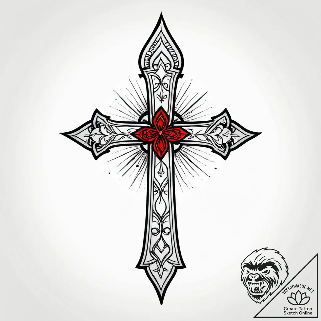 This striking tattoo sketch features a gothic cross, rendered with a delicate yet bold linework that evokes the rawness of a hand-drawn piece. The interplay of fine lines and cross-hatching creates a sense of depth, while the vibrant red floral accent at the center bursts forth like a sacred flame, imbuing the design with a dramatic, two-tone intensity against the stark white background.
