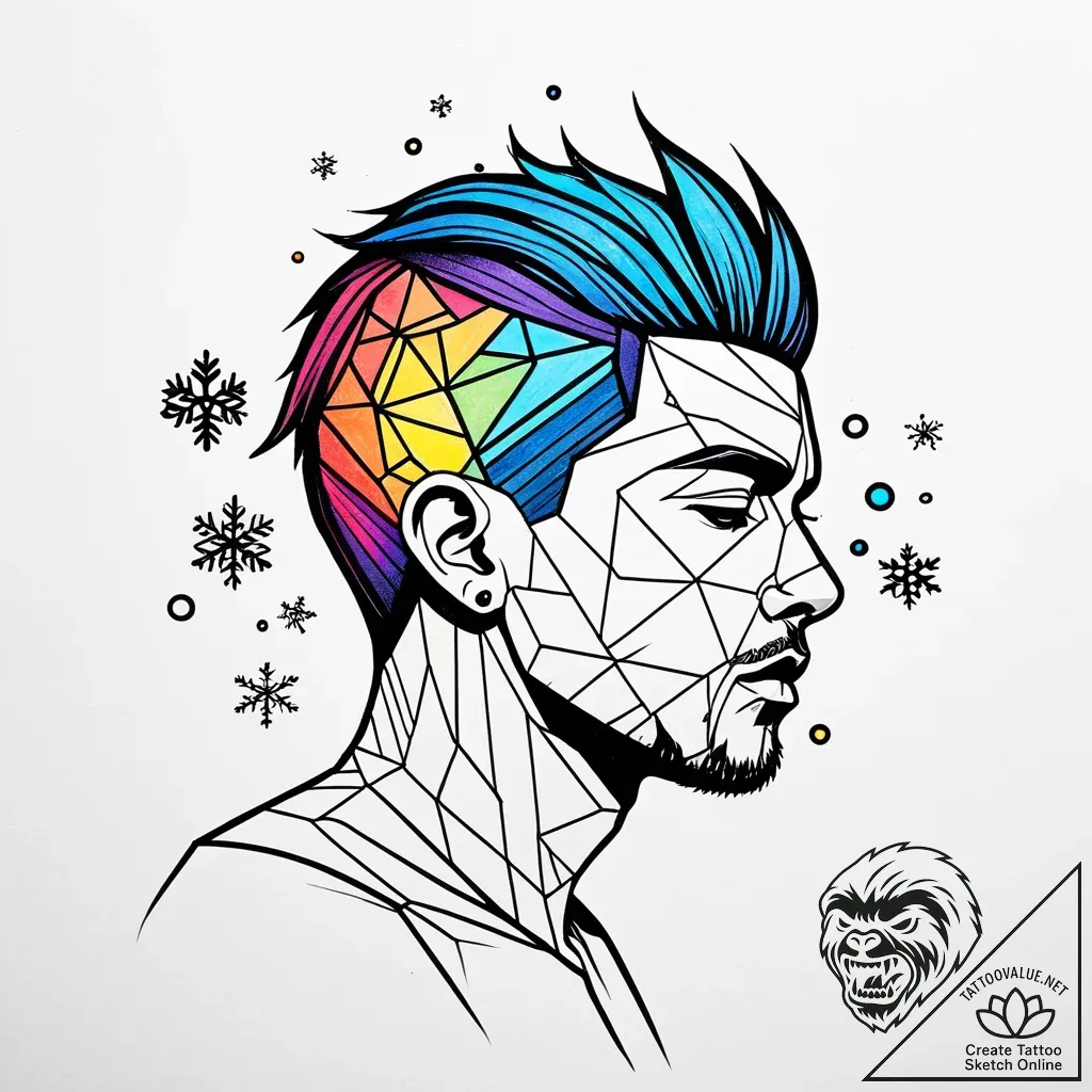 • Original User Request (RU): eskiz.to, tattoo sketch, manny head silhouette with snowflakes, geometric tattoo, artistic tattoo sketch, clean lines, crisp outlines, sharp linework, minimalist tattoo design, simple clean lines, tiny tattoo, subtle design, on a clean white paper, isolated, vibrant colors, full color spectrum, bold bright tattoo inks