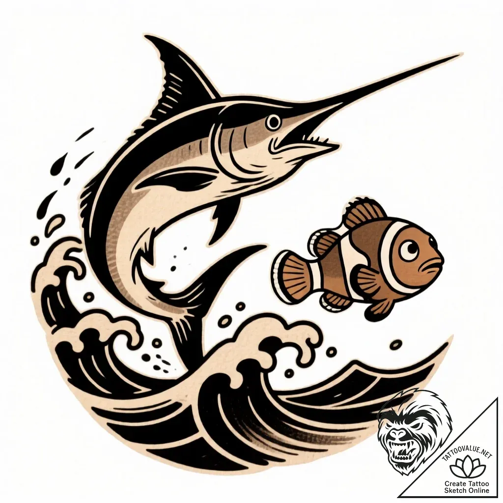 - Original User Request (RU): eskiz.to, tattoo sketch, marlin and nemo jumping through waves, action packed, tattoo sketch design, sepia tone sketch, vintage paper look, bold outlines, thick lines, heavy linework, blackwork tattoo style, dark art, bold black areas, heavy black ink, on a clean white paper, isolated