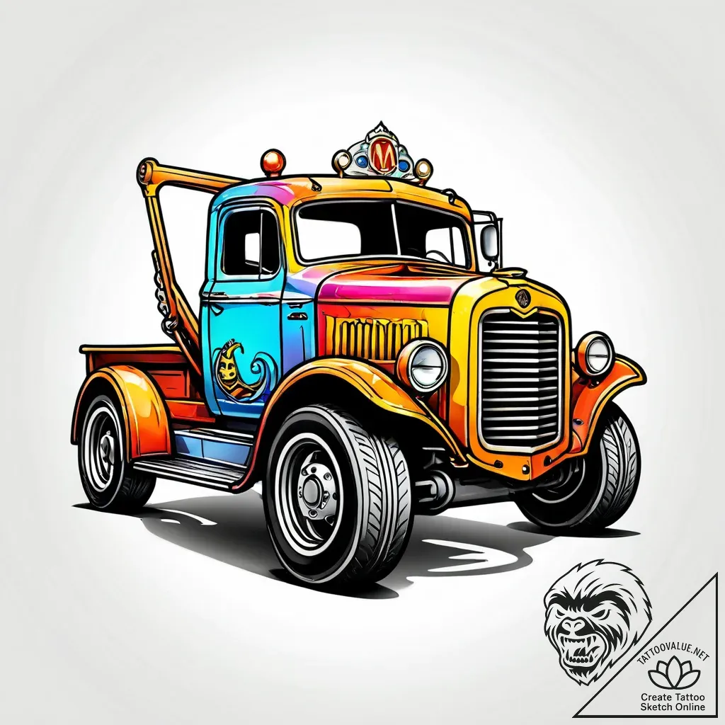 This vibrant linework tattoo sketch bursts with personality, capturing the iconic Tow Mater in a playful, almost cartoonish style. Bold, thick outlines anchor the design, while a full spectrum of bold, bright colors brings the character to life, reminiscent of a classic comic book panel. The composition is dynamic, with Mater's signature grin and slightly askew elements hinting at his endearing, clumsy charm.