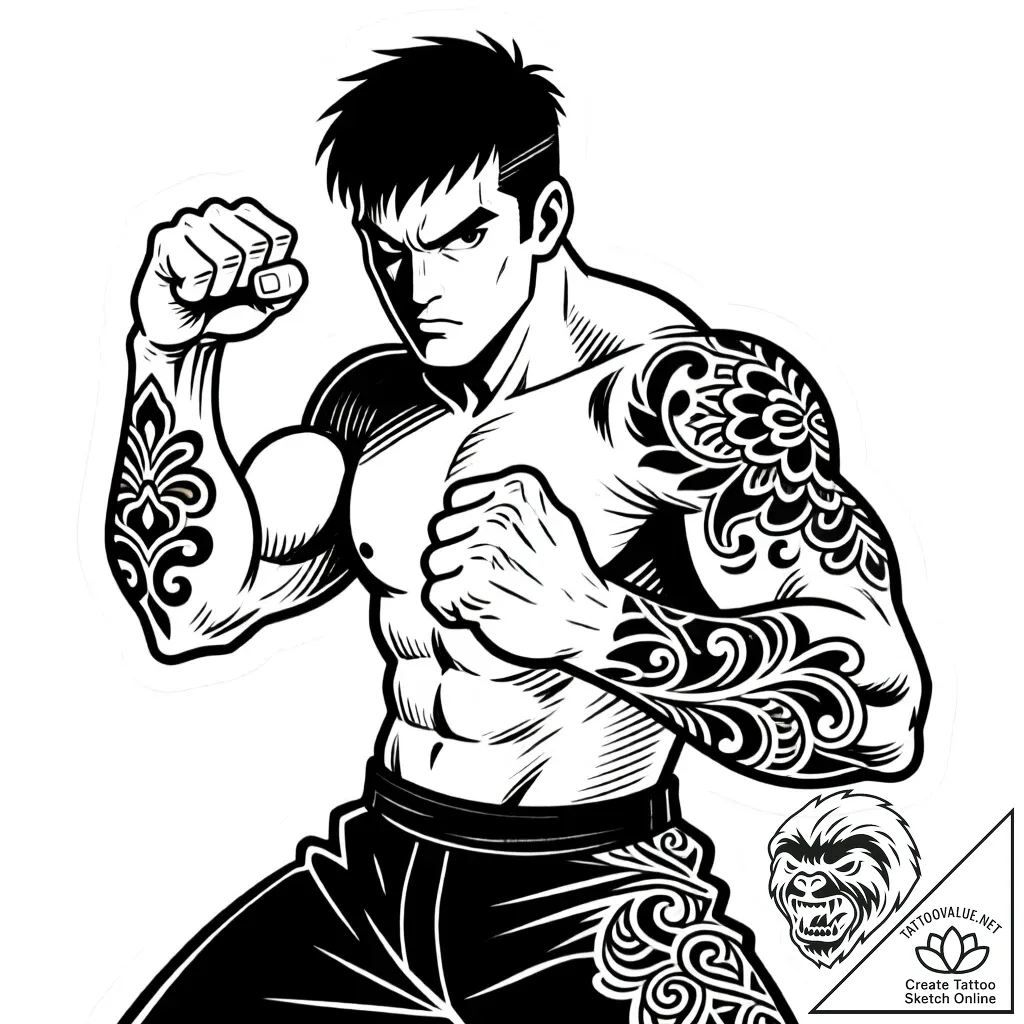 This striking tattoo sketch is a testament to the raw power and refined artistry of comic-style illustration. The central figure, a formidable warrior, is depicted with an intensity that leaps off the page, his muscles taut and his gaze unwavering. Adorning his form are intricate ornamental patterns, a delicate dance of filigree and flowing lines that contrast beautifully with the boldness of the character, all rendered in a pure, unadulterated black outline.