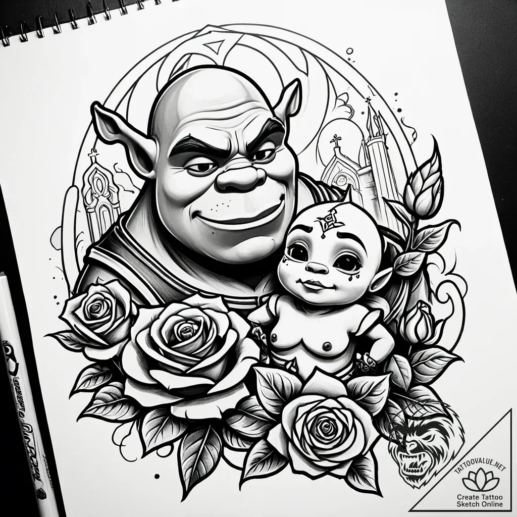 - Original User Request (RU): eskiz.to, tattoo sketch, shrek with baby ogre, tender moment ink drawing, artistic tattoo sketch, clean lines, crisp outlines, sharp linework, chicano tattoo style, fine line black and grey, religious iconography, lettering, roses, skulls, on a clean white paper, isolated, muted color palette, desaturated colors, vintage tattoo feel
