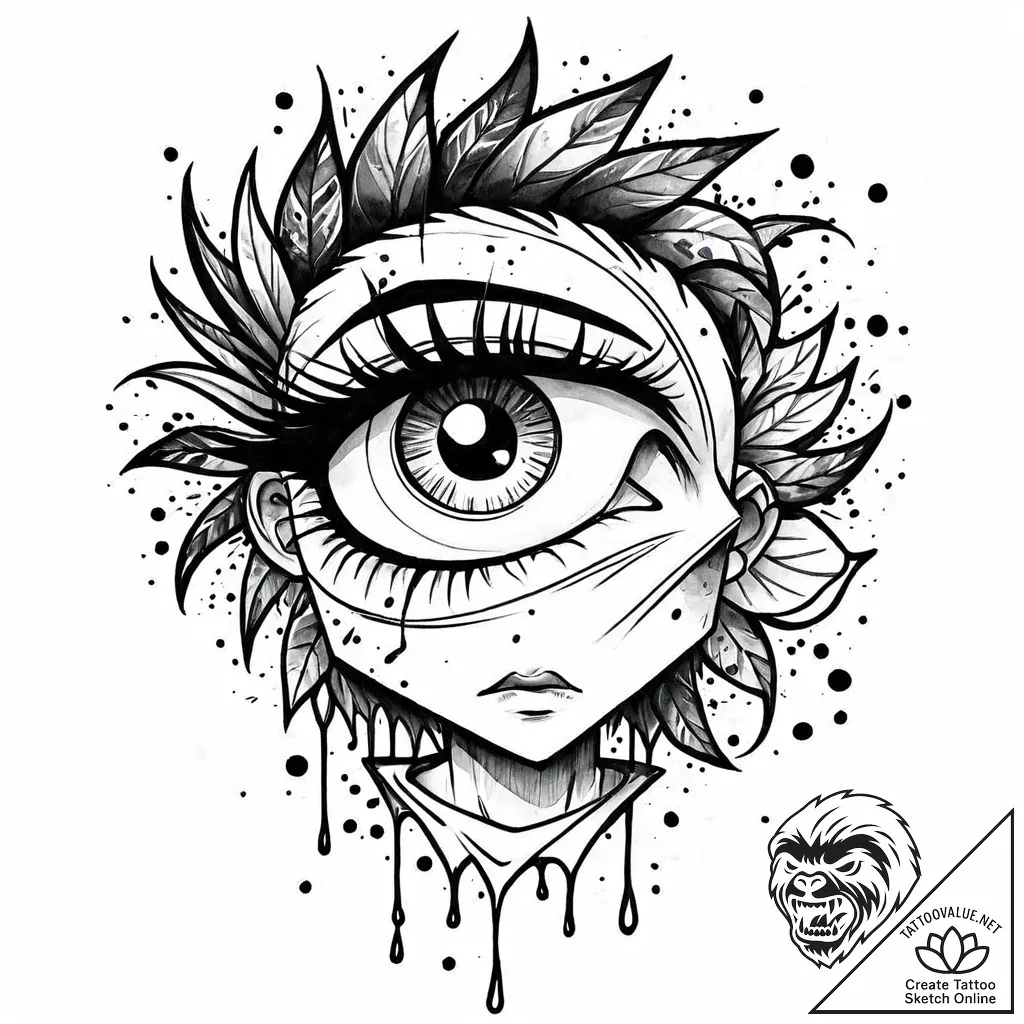 The exaggerated eye symbolizes profound perception, intuition, and a deep understanding of the world. The leafy elements can represent growth, nature, and transformation, while the overall design speaks to individuality and the courage to see beyond the surface. This tattoo can signify someone who is observant, introspective, and embraces their unique perspective.