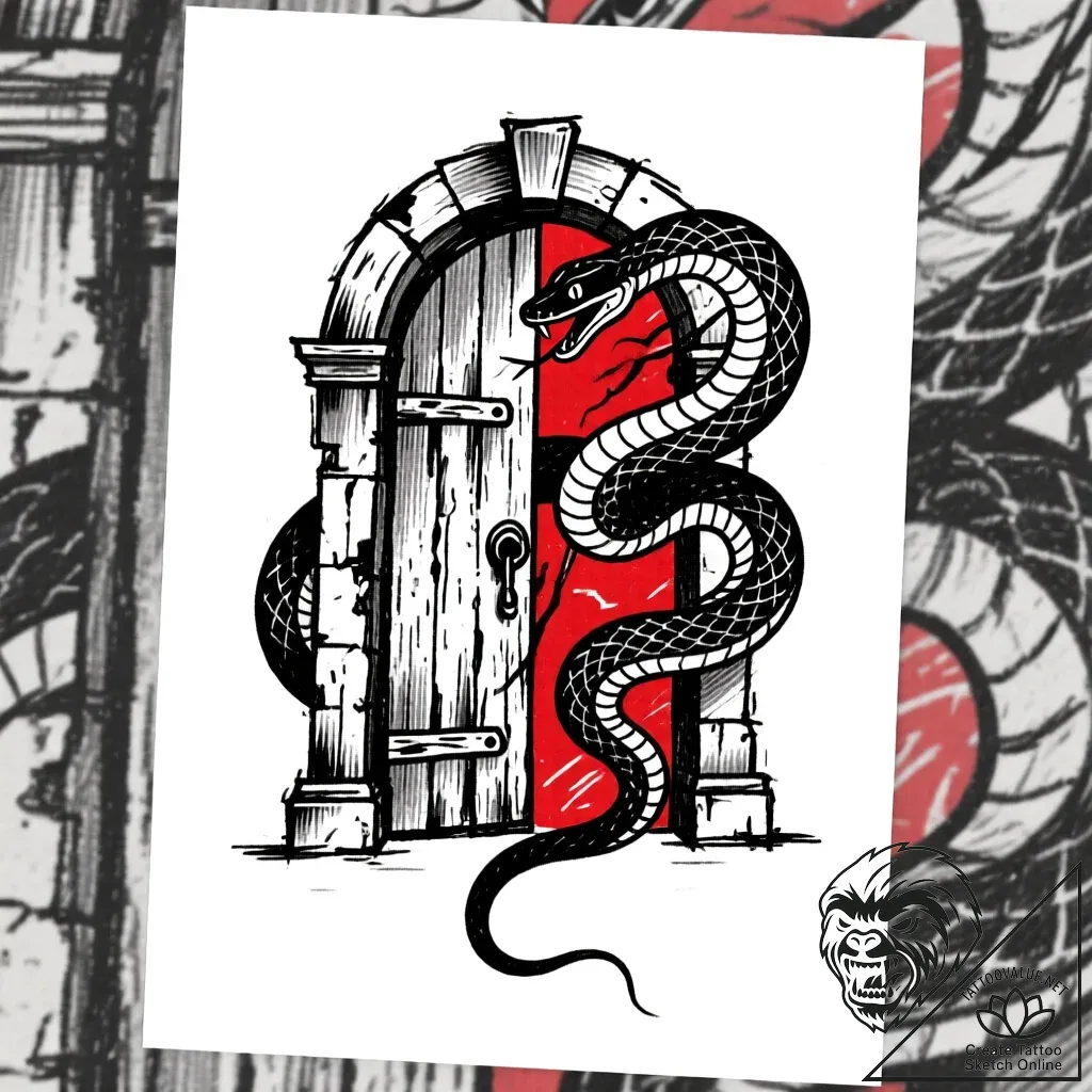 tattoo sketch, tattoo design, isolated tattoo sketch on pure white background, An ethereal serpent gracefully circles an ancient, weathered gate. The artwork is rendered in a tattoo drawing outline style, heavily influenced by trash polka aesthetics. The primary ink colors are black and red, creating a collage-like composition with abstract realism elements. Graphic elements and rough, sketchy lines contribute to a hand-drawn pencil sketch effect, giving it an artistic, unfinished look. The entire piece is presented on clean white paper, isolated, with moderate detail and balanced complexity. The subject is clearly defined, presented as a black and white sketch with greyscale tones, emphasizing a monochrome aesthetic.