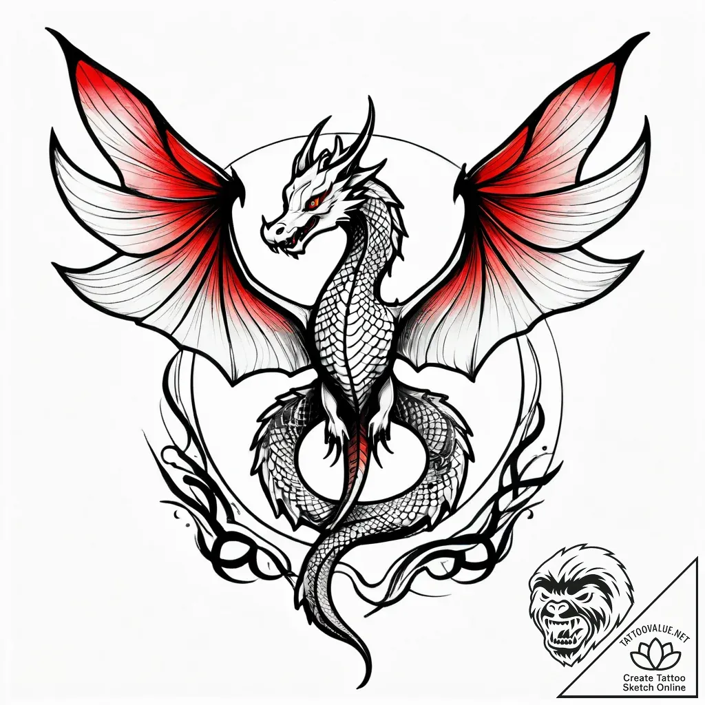 This dynamic tattoo sketch depicts a powerful dragon, its form coiled within a heart-shaped frame of interwoven waves and web-like structures, reminiscent of traditional Irezumi artistry. The dramatic two-tone palette of black and striking red, particularly in the feathered wings, creates a sense of ethereal energy and controlled fury. The rough, hand-drawn quality lends an organic feel, suggesting a creature born from myth and rendered with raw artistic force.
