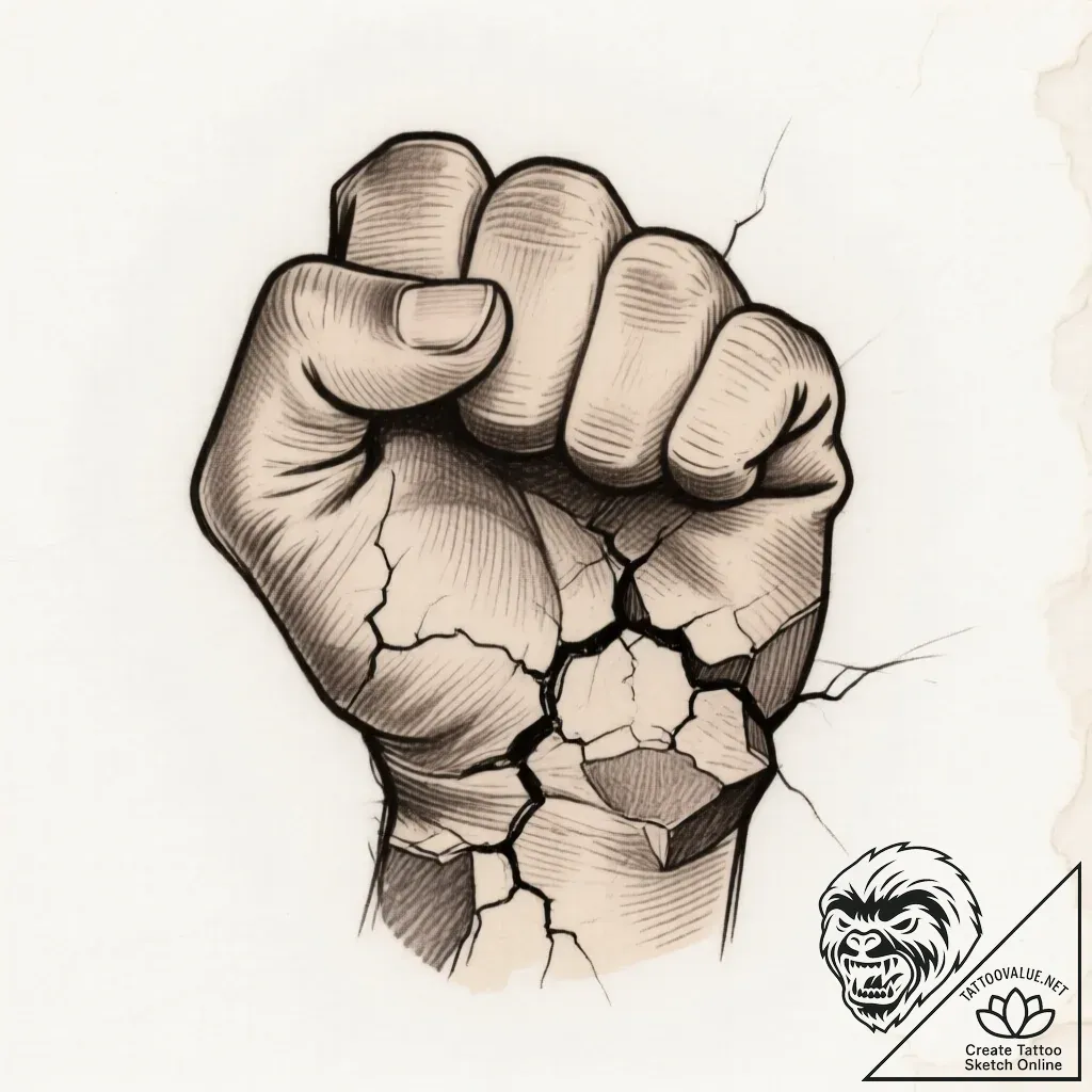 This sketch captures a clenched fist, not of flesh, but of fractured earth and stone, breaking apart like an ancient monument. Rendered with rough, sketchy linework and a hand-drawn pencil effect, it possesses an artistic, unfinished quality characteristic of fine linework tattoos. The sepia tones and vintage paper aesthetic imbue it with a timeless, graphic power.
