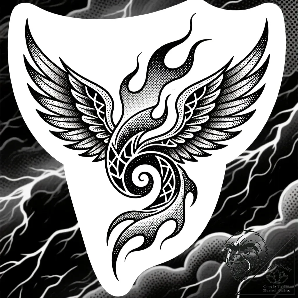This design is perfect for individuals who have faced significant challenges and emerged triumphant, or those who possess a strong, resilient nature. It would look impressive on the forearm, allowing the dynamic swirling elements to wrap around the limb, or on the back between the shoulder blades, evoking the majesty of flight.