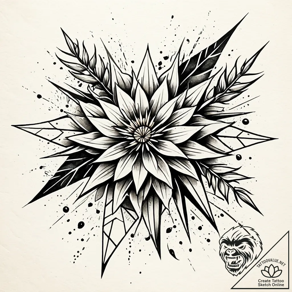 This striking tattoo sketch is a masterful blend of organic growth and sharp, geometric fragmentation, creating a visual paradox. The central bloom, depicted with delicate, graphic linework and subtle shading, unfurls with an almost celestial grace, while fractured, sharp-edged forms and scattered ink splatters evoke a sense of powerful, yet controlled, disruption. The overall mood is one of resilient beauty emerging from chaos.