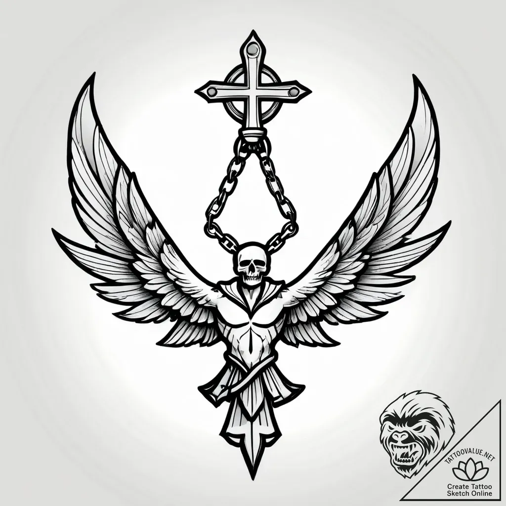 The skeletal figure often symbolizes mortality and the passage of time, while the fractured wings represent a loss of freedom or broken aspirations. The chains binding it to the cross can signify a spiritual burden or a difficult path. This design can emphasize resilience in the face of adversity and the acceptance of life's inherent challenges.