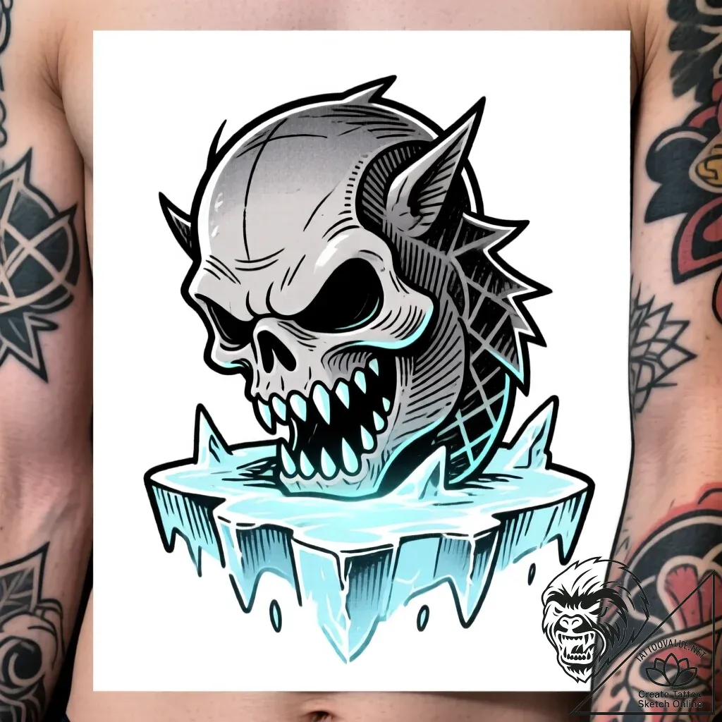 This striking tattoo sketch captures a fearsome skull emerging from a crystalline iceberg, rendered in a vibrant, new school graffiti style. The black and grey shading, enriched with cross-hatching and smooth gradients, creates a dramatic, almost otherworldly glow, like a frozen relic brought to life with a touch of cartoonish exaggeration.