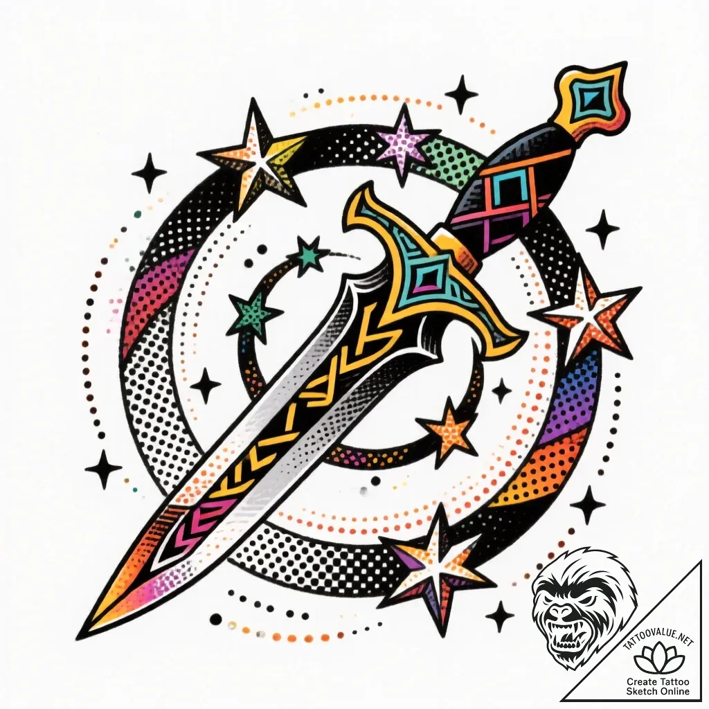 This dynamic tattoo sketch portrays a dagger, a celestial weapon, as if it's a comet streaking through the cosmos, adorned with intricate glyphs and surrounded by a nebula of stars rendered in vibrant, full-spectrum hues. The piece masterfully blends graphic linework with the delicate artistry of dotwork, stippling, and pointillism, creating a visually stunning tapestry of geometric patterns and deep, cross-hatched shading that evokes a powerful sense of movement and cosmic energy.